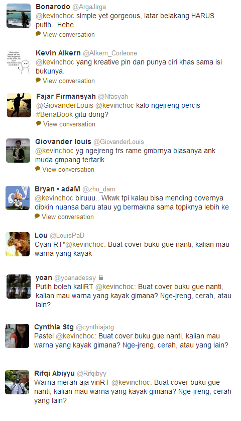 “Ada ilustrasi atau ide nggak kayak gimana cover kamu nanti, biar bisa narik pembeli gitu?”